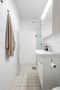 Ett fräscht badrum som håller god standard och som är utrustat med dusch, handfat, WC och spegelskåp.