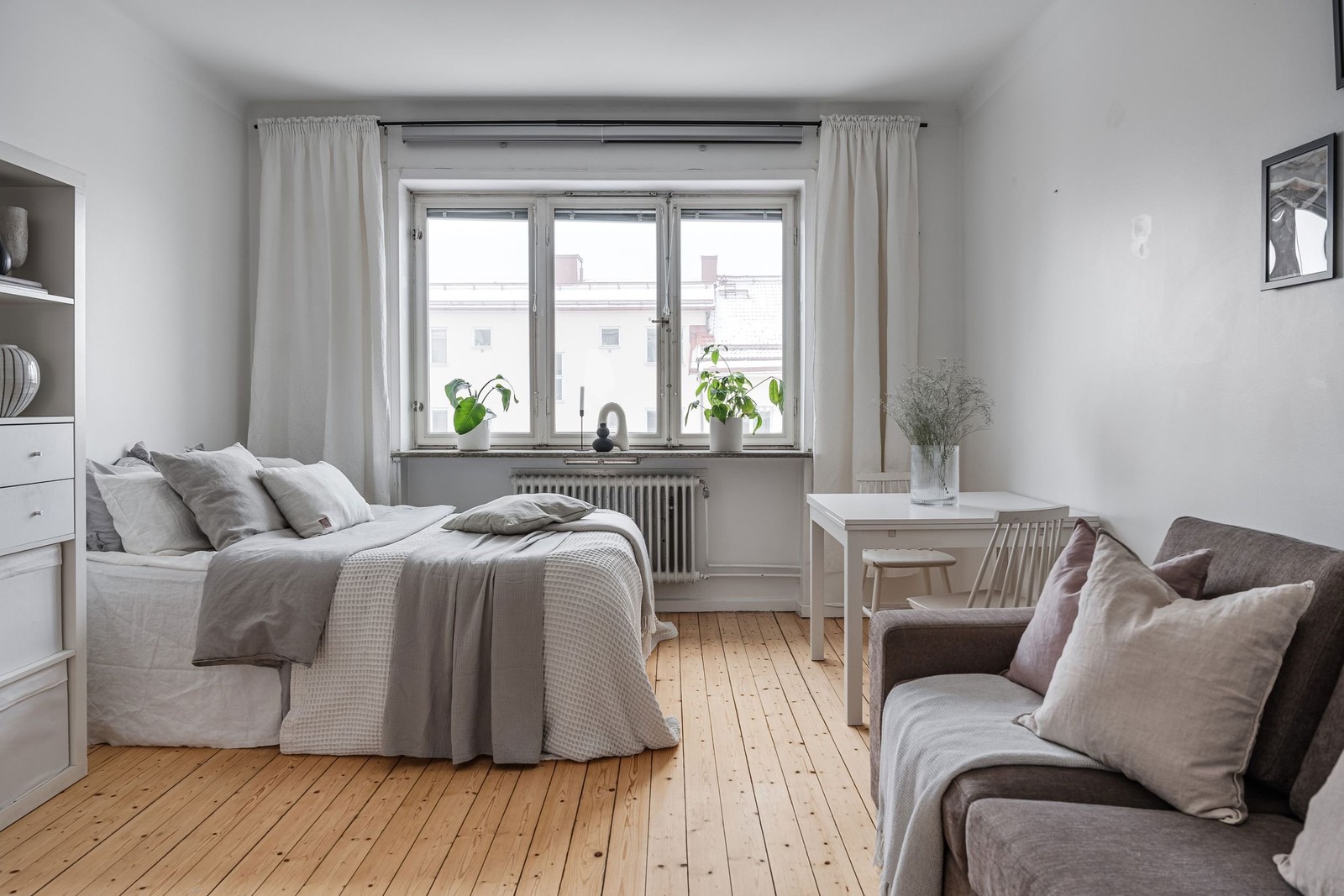 Vardagsrum med plats för såväl soffa, säng och matbord. Härligt ljusinsläpp från stort fönster och förvaring erbjuds i inbyggd garderob.