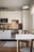 Yteffektiv kokvrå utrustad med spishäll, ugn, diskho, micro samt kyl/frys. Mörkt golv och ljusa skåpsluckor.