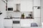 Köket är trevligt med vit skåpinredning och ovan bänkskivan sitter ett vitt kakel. Köket är utrustat med kyl/frys, ugn, spis, diskmaskin, fläkt och diskho. Här finns gott om plats för ett rejält matbord. Till höger om ingången till köket finns ett extra förvaringsskåp. Även här ligger ett vackert trägolv.