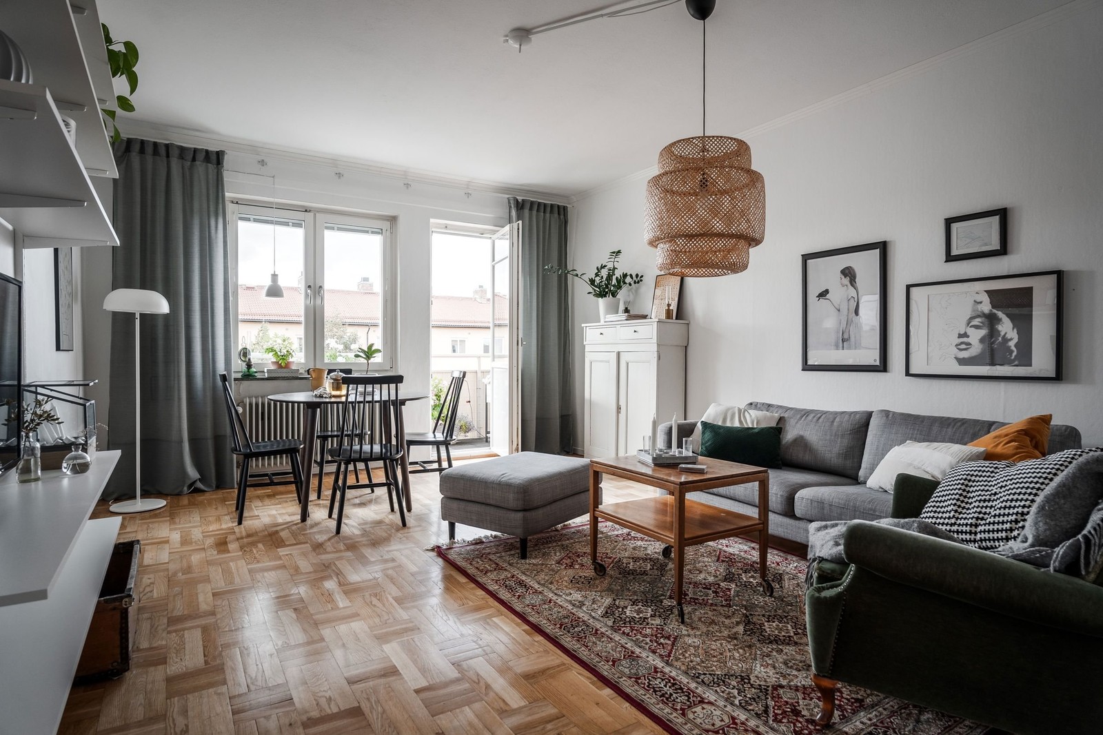 Här bor du högst upp i huset i en stilfullt renoverad 1940-talstrea där klassiska originaldetaljer möter moderna bekvämligheter. Gavelläget med fönster i tre väderstreck skapar ett fantastiskt ljusflöde genom hela lägenheten, och den soliga balkongen i sydväst blir snabbt en självklar favoritplats för långa sommarkvällar.