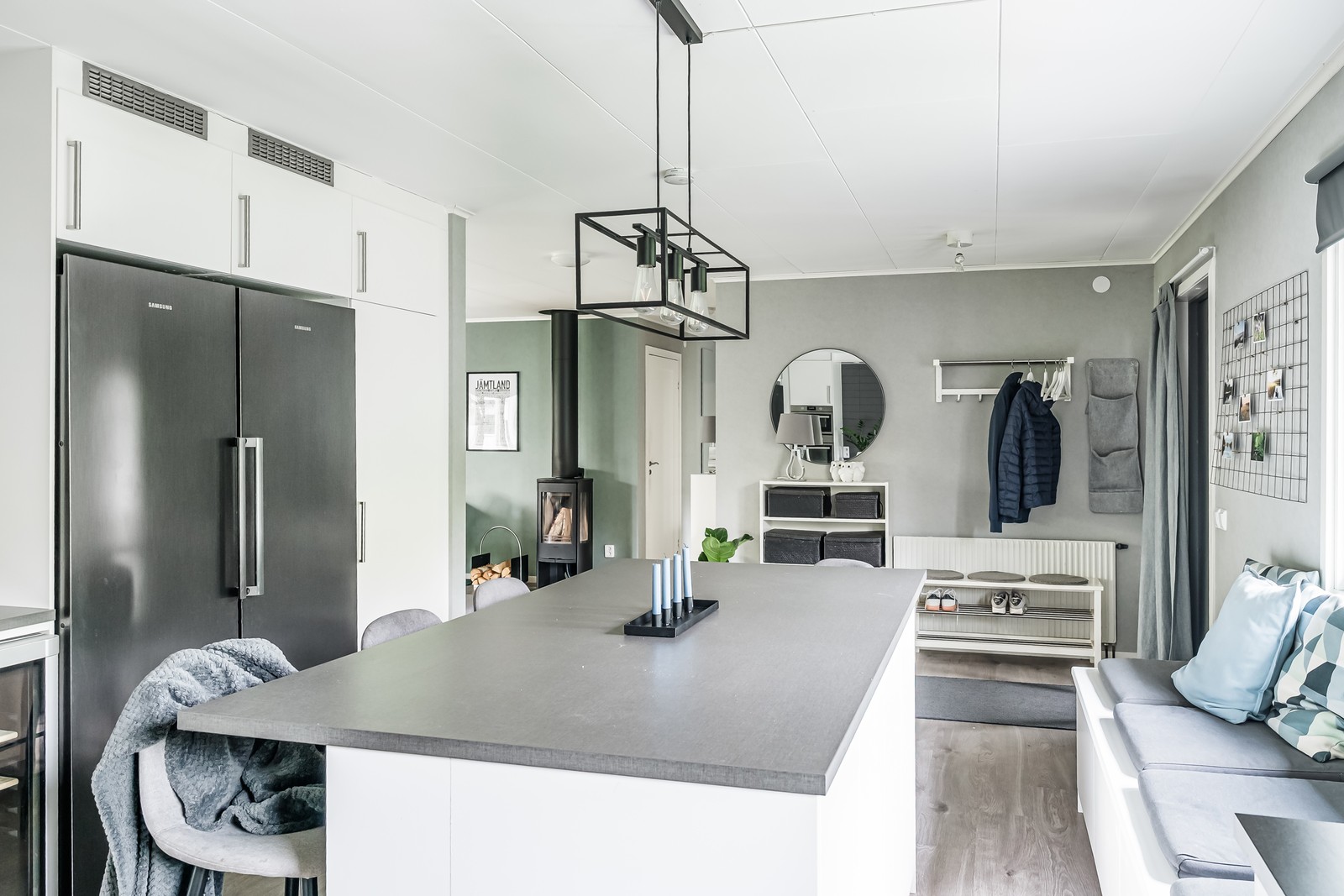Välkomnande hall med plats för avhängning av ytterkläder. Direkt från hallen möts vi av det fina köket och den öppna planlösningen mot vardagsrummet.