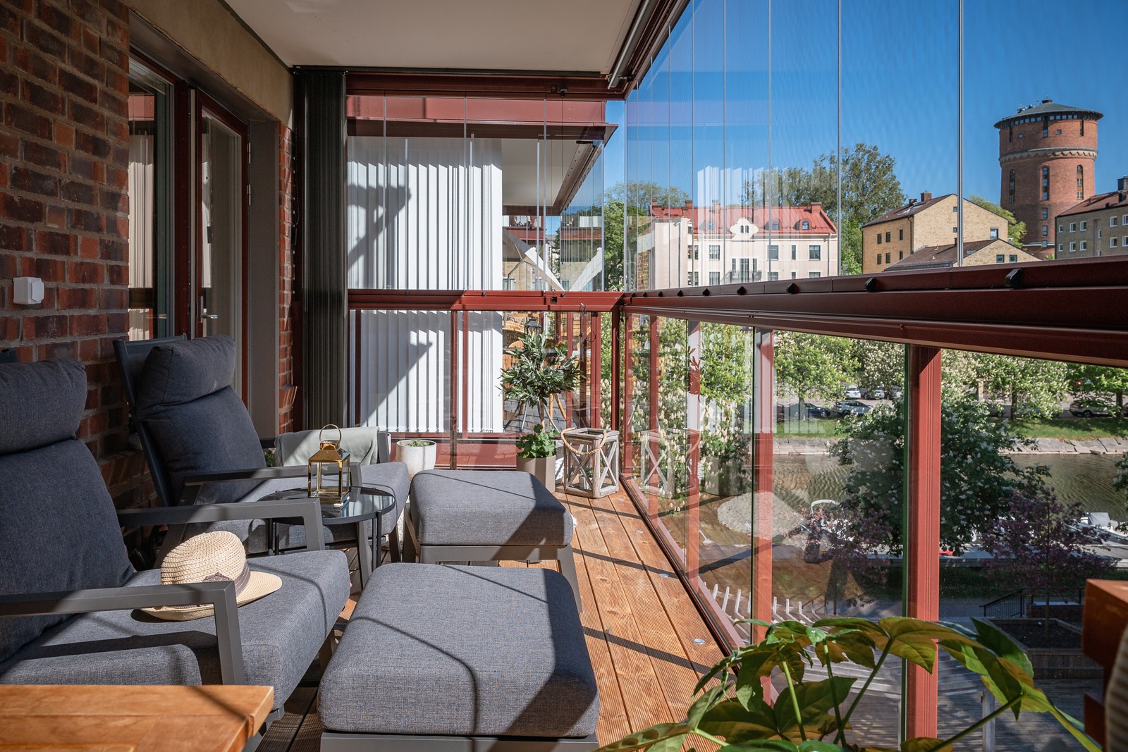 Inglasad och rymlig balkong i söderläge. Här finns trall på golvet med inbyggd ljus samt infravärme installerad så man kan förlänga säsongen. Solgardiner och solfilm installerad så man kan justera för en behaglig värme.