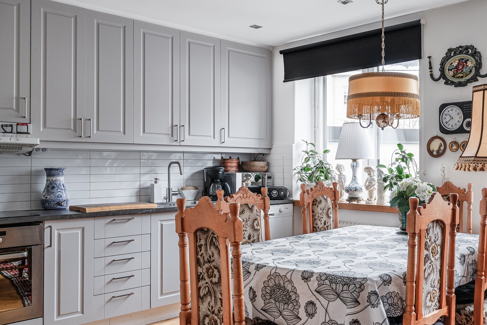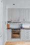 Ett större kök med förvaring i både över och underskåp. Skåpsluckor med spegling i som ger en hemtrevlig känsla. Luckorna är i en varmare gråfärg och ger ett varmare intryck. Köket är utrustat med ugn, häll, fläkt, kombinerad kyl och frys samt diskmaskin.