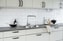 Tidlöst kök med ljusa snickerier och grå bänkskiva som snyggt bryter av med den vita kaklet ovan bänk. Maskinellt utrustat med hel kyl och frys, inbyggd mikro, spishäll, ugn, fläkt och diskmaskin. Spotlights som skapar en exklusiv känsla och två diskhoar underlättar i vardagen. Plats finns för matbord intill fönsterpartiet samt utgången till uteplatsen på framsidan. Ljusa väggar och parkett på golv.
