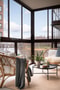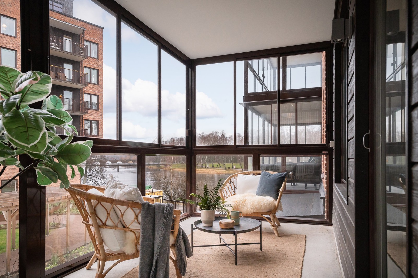 Detta är en av de lite mindre varianterna av tvårumslägenhet som har väl fördelade kvadratmeter. Kök och vardagsrum i en öppen planlösning med utgång till den stora inglasade balkongen. Sovrummets planering möjliggör en bra arbetshörna och förvaringen blir i form av en klädkammare. Fullt utrustat kök med bl.a. både kyl och frys i fullhöjd.