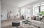 Hallen har klinkergolv i en brungrå kulör, vidare in i lägenheten ligger ett vitpigmenterat, mattlackat ekparkettgolv från Kährs. Skjutdörrsgarderoben har vita dörrar med profil i matt silver och är inredd med Elfas förvaringssystem med klädstång och meshbackar för källsortering