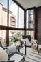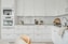 Öppen planlösning mellan kök och vardagsrum, den rymliga, inglasade balkongen nås från vardagsrummet. Köket är utrustat med helintegrerad diskmaskin, separat kyl och frys samt ugn och mikro i praktisk arbetshöjd i högskåp. De släta skåpsluckorna har kulören sandbeige och får handtag i rostfritt. Ovanför diskbänken sätts ett vitt, blankt kakel som med sin stående sättning bidrar till det stilrena intrycket. Köksinredningen kommer från Vedum och har fullutdragslådor med dämpning, karusellskåp i hörnskåpet, underlimmad diskbänk i laminatbänkskiva (Vedums Marfil Cream) och LED-list som belysning under överskåp.