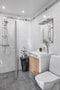 Helkaklat badrum med duschhörna, kommod, spegel och WC-stol.