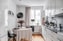 Modernt kök med vita snickerier. Trevligt med plats för matbord samt ljusinsläpp från det charmiga fönstret. Klassiskt golv och tapetserade väggar i en klassisk randig tapet. Köket är utrustat med; integrerad diskmaskin, kombinerad kyl och frys, spis samt en inbyggd micro. Praktiskt med över-och underskåp.