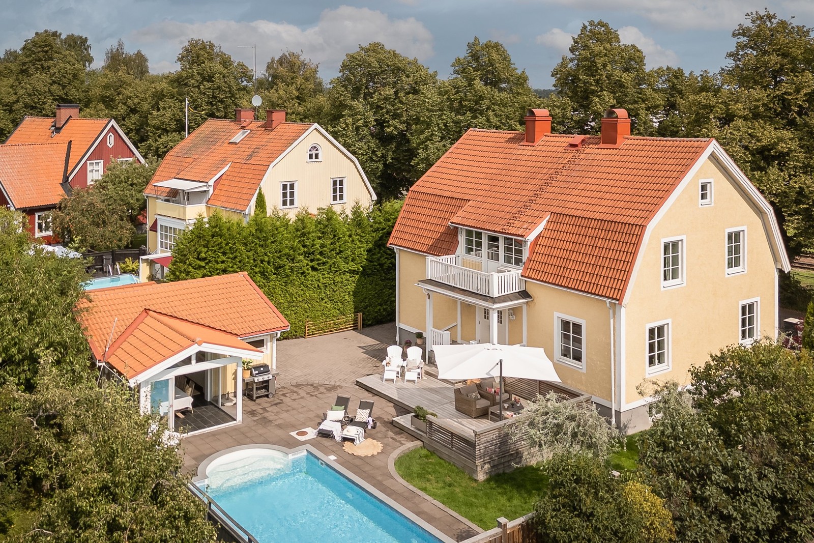 Trevlig utemiljö med pooldäck på baksidan. Flera uteplatser och inbyggt uterum.