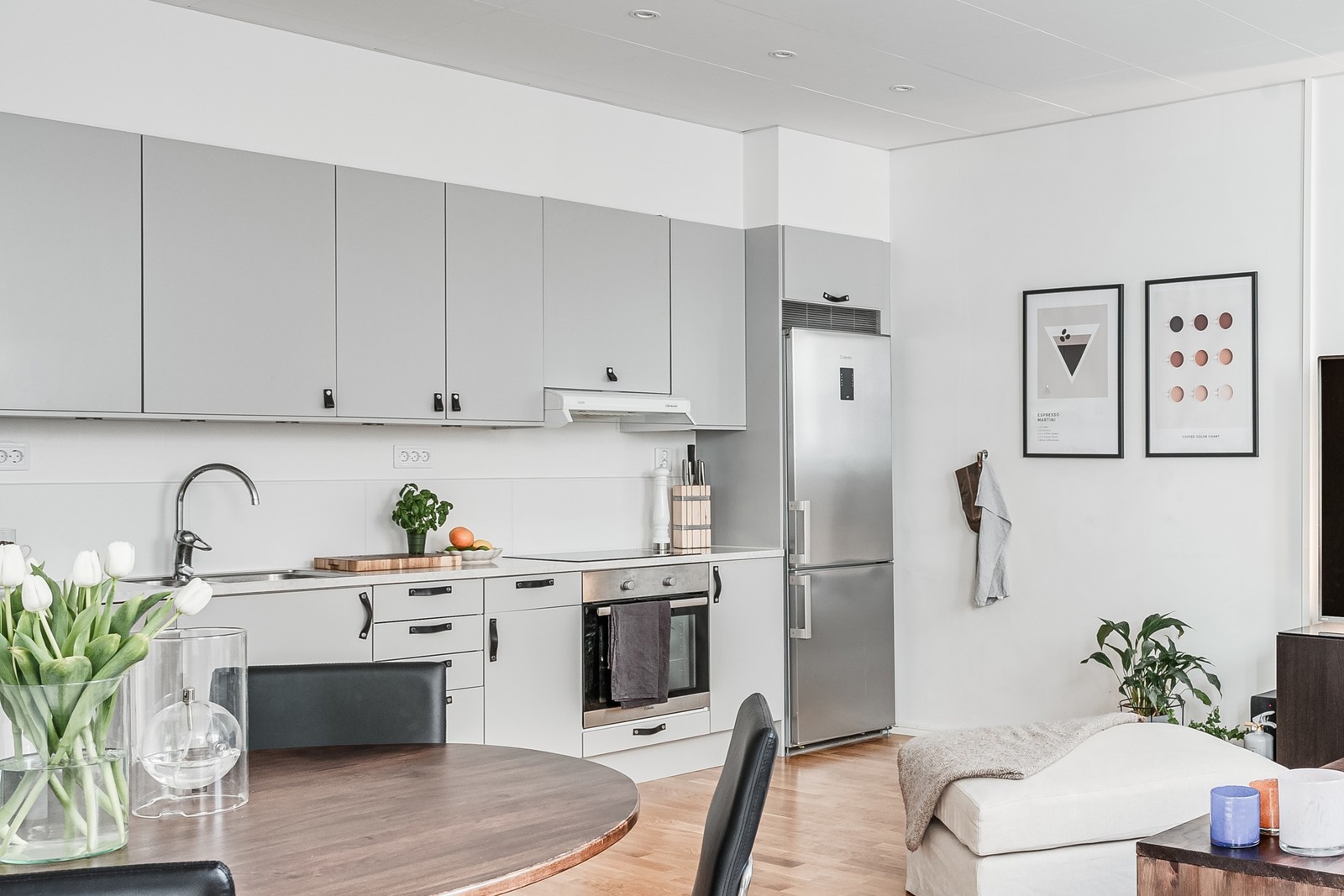 Stilrent kök med släta luckor och moderna handtag i läder. Luckorna är ljust gråa. Det finns gott om arbetsyta och förvaring i både under och överskåp. Köket erbjuder; ugn, häll, kombinerad kyl och frys och diskmaskin. Det finns plats för matsalsdel.