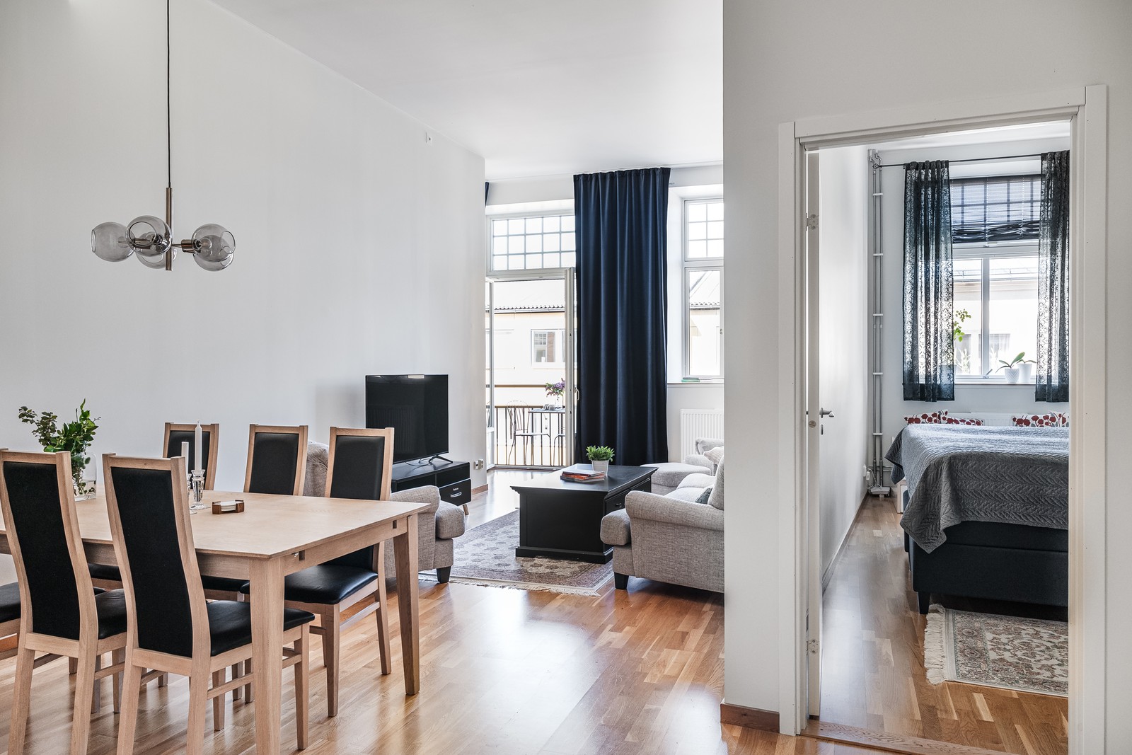 Välkomnande hall som öppnar bostaden. Plats för avhängning. Direkt när vi kommer in genom dörren till bostaden så möts vi av det härliga ljuset från dom stora och höga fönstrena.