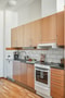 Modernt inrett kök med med snickerier i ek. Kyl/frys i kombination, diskmaskin, spishäll samt varmluftsugn. Gott om förvaring och arbetsyta.