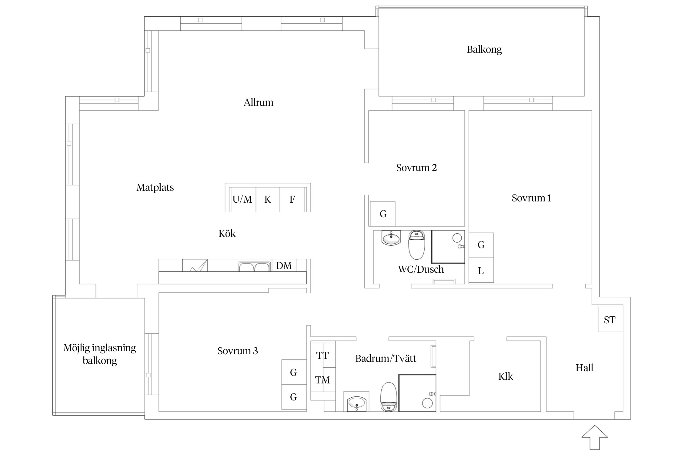 Förvaring ges i garderob samt linneskåp enligt planritning.