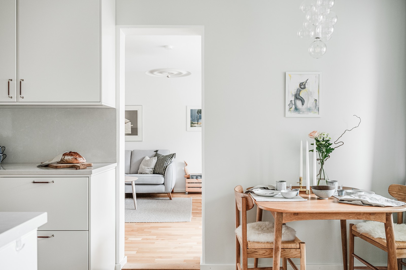 Vardagsrummet öppnar upp fint med stora fönster som ger härligt ljusinsläpp. Plats finns för soffgrupp samt matplats om så skulle önskas. På golvet ligger parkett och väggarna är ljusa.