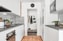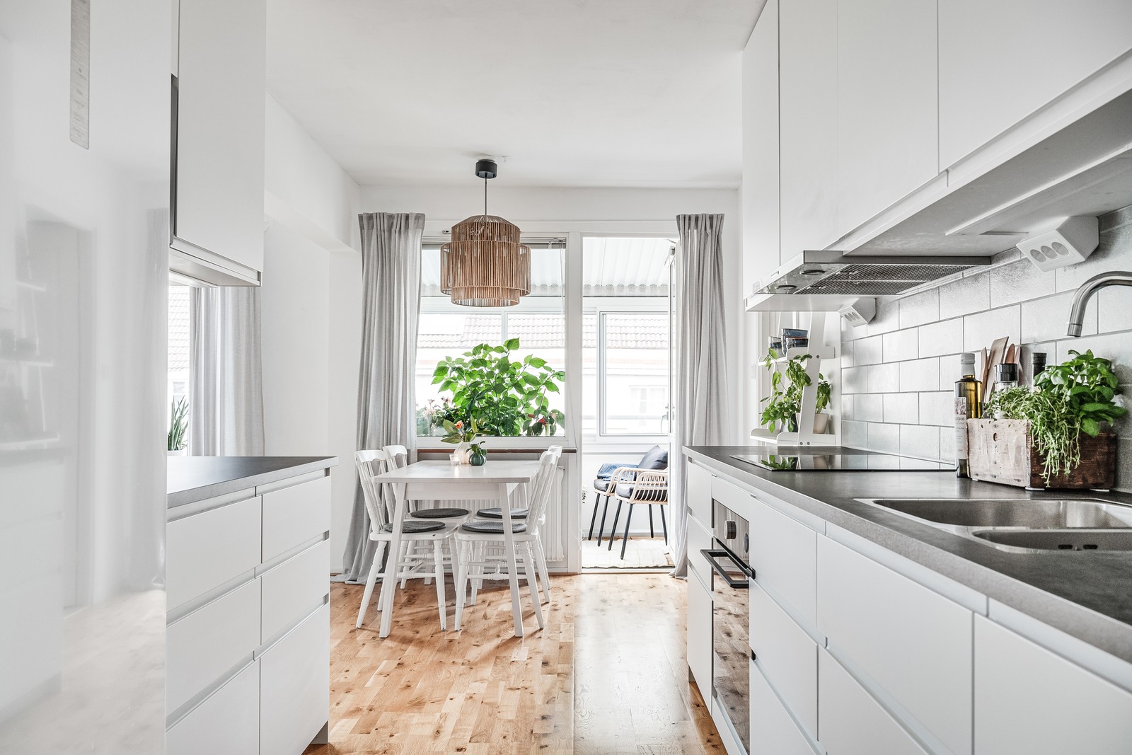 Luftigt kök med plats för köksbord. Det är vita väggar och parkettgolv. Köket är utrustat med hel kyl och frys, micro med ångfunktion, ugn, induktionshäll samt fläkt som är bytt 2021. Köket renoverade 2020. Modernt IKEA-kök i vitt.