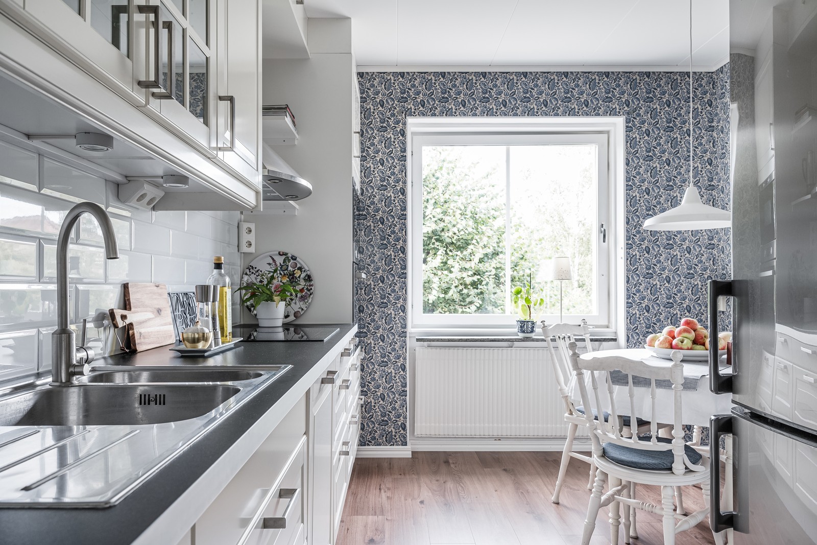 Kök med luckor i vitt och kakel i vitt. Stilrent golv och läckert tapetserade väggar. Här finns gott om plats för matsalsgrupp. Köket är utrustat med kombinerad kyl och frys, ugn, häll, fläkt, inbuggs mikro och diskmaskin.