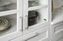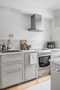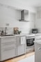 Modernt kök från Ikea (2021) med stilrena släta luckor i grå ton. Köket är utrustat med häll, ugn, diskmaskin samt kombinerad kyl och frys. Här finns även en dekorativ vitrindel som ger både förvaring och karaktär. Smart planerat med goda arbetsytor och plats intill fönster.