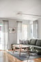 Stort vardagsrum med fönster i två väderstreck vilket ger ett behagligt ljusinsläpp. Gott om plats för såväl soffgrupp som matsalsmöbel. Här har även en braskamin installerats.