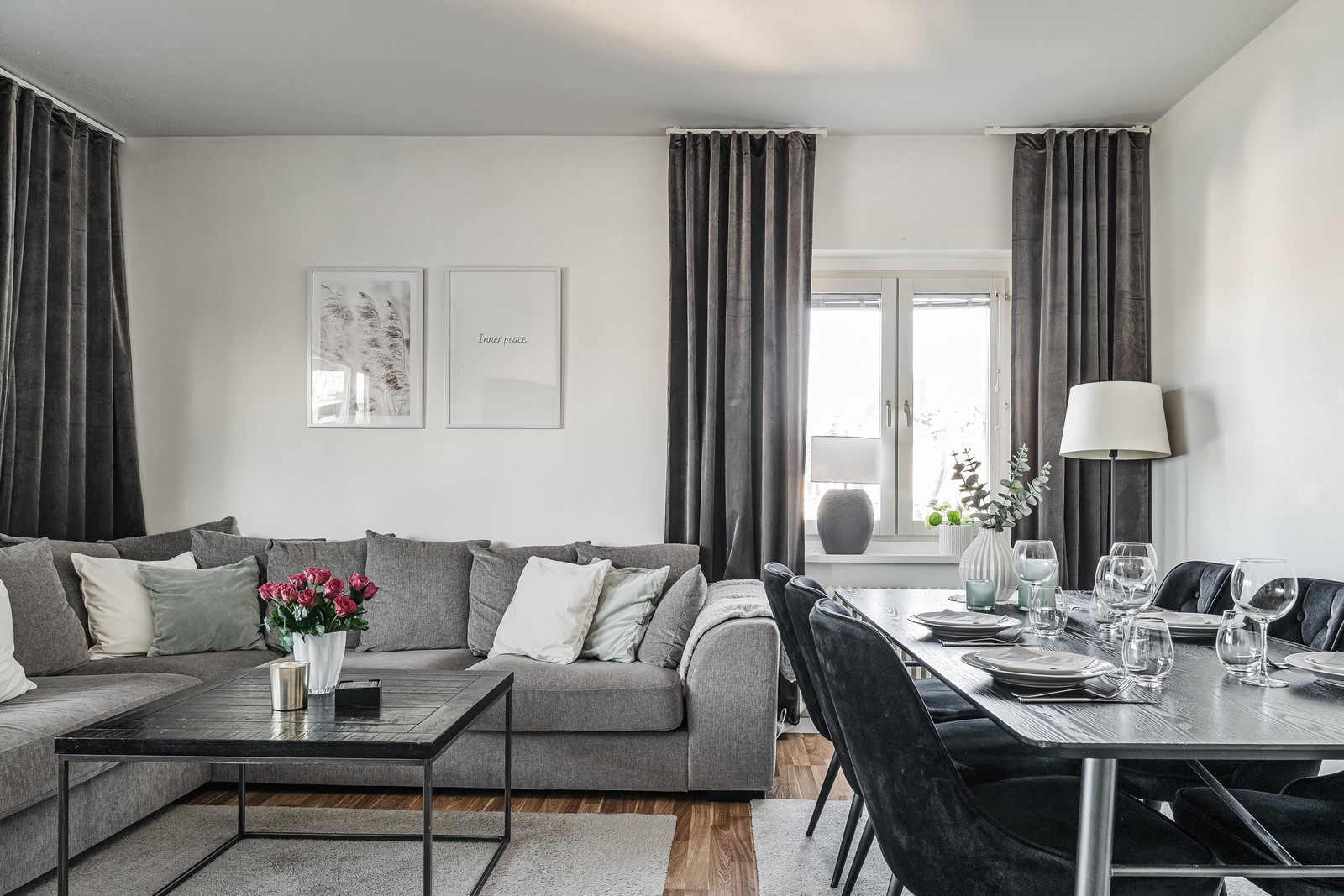 Luftigt och trivsamt vardagsrum! Plats för både matsalsgrupp och en större soffa. Det finns fönster i två väderstreck. Härifrån når man bostadens inglasade balkong som förlänger lägenheten med utsikt över området.