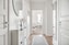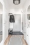 Praktisk hall med avhängning för ytterkläder till höger. På golvet ligger ett snyggt, klassiskt golv och väggarna är målade i vitt.