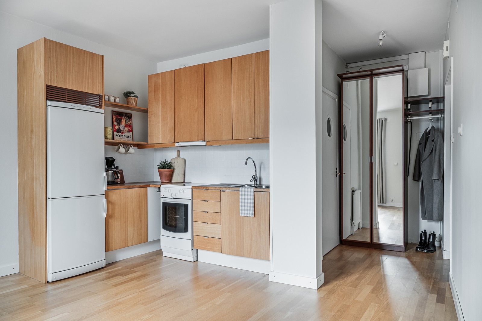 I öppen planlösning med köket ryms både säng och soffa i rummet. Önskar man mindre matgrupp finns det även möjlighet för detta. Ljust målade väggar och härlig takhöjd.