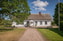 Planlösning Lärarbostaden: Entréplan rymmer två sällskapsrum i fil, trägolv och ljusa väggar. Utsikt mot framsidan och ängarna bidrar till en ljus känsla.