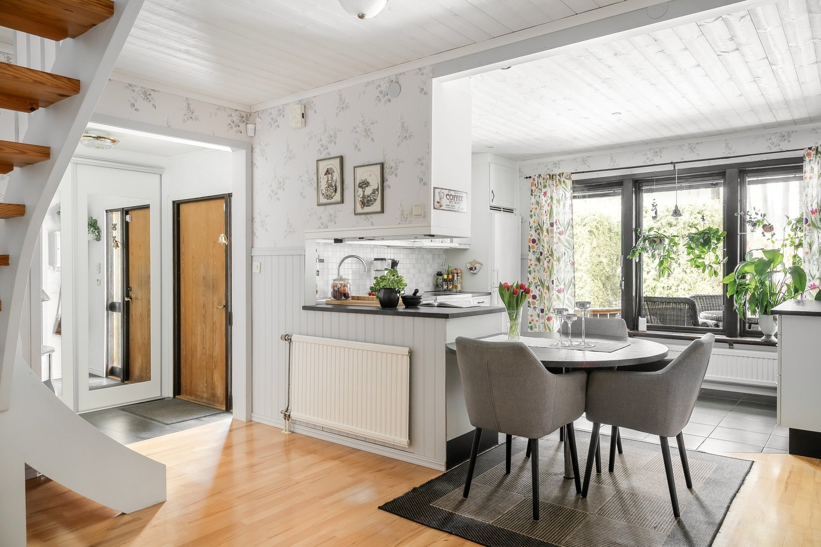 Tidlöst kök med snickerier i vitt där gott om förvaring ges i både över- och underskåp. Köket är maskinellt utrustat med kyl, diskmaskin (2023), spis/ugn (2023) samt fläkt. Här ges gott om arbetsyta och trevligt med plats för matbord i direkt anslutning till köket eller intill fönstret. Från köket kommer du direkt ut till den rymliga altanen som är belägen mot trädgården på framsidan - sitt här och njut av solen hela dagen! Ljusa väggar och praktiskt med klinker på golv. Spotlights i tak. I den inre hallen som ligger i anslutning till köket finns en frys installerad.