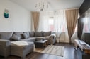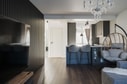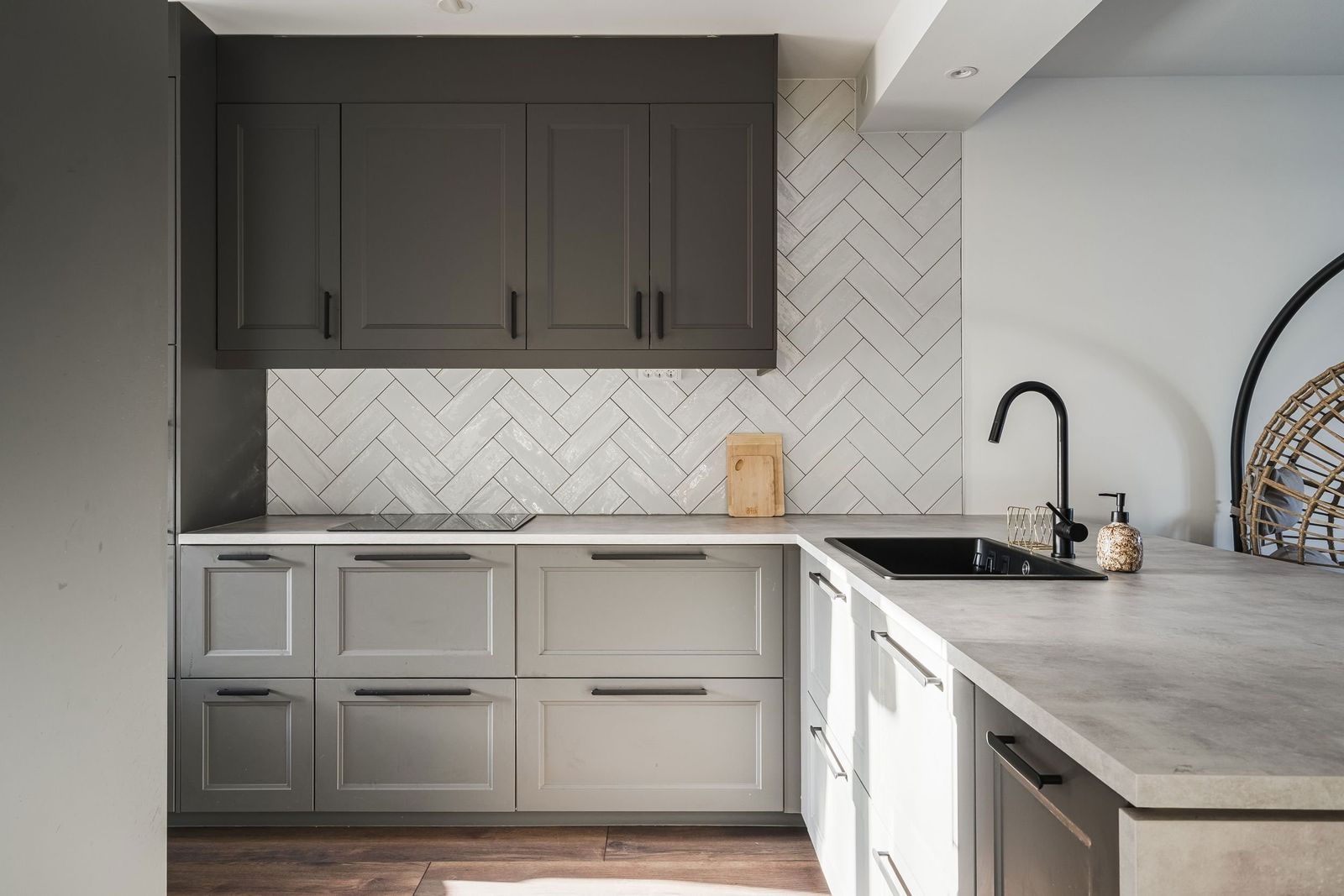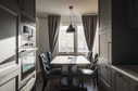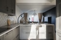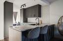 Stilrent och smakfullt renoverat kök med mörka köksluckor, vitt kakel, bänkskiva i laminat, diskho samt blandare i matt svart rostfritt stål. Laminatgolv och ljusa väggar. Maskinparken består av en induktionshäll, varmluftsugn, köksfläkt, integrerad mikro, diskmaskin samt en kombinerad kyl och frys. Här får man plats med en matgrupp för ca fyra personer. Modern och öppen planlösning som avgränsas via en köksö mot vardagsrummet.