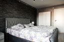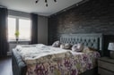 Stort sovrum som får plats med en dubbelsäng, förvaringsmöbel och övriga sovrumsmöbler. Laminatgolv och mörka väggar.