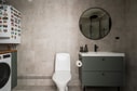 Exklusivt badrum med modern inredning. Här finns det en WC, handfat, dusch, tvättmaskin och torktumlare. Klinker golv, kaklade väggar, golvvärme och spotlights i taket.