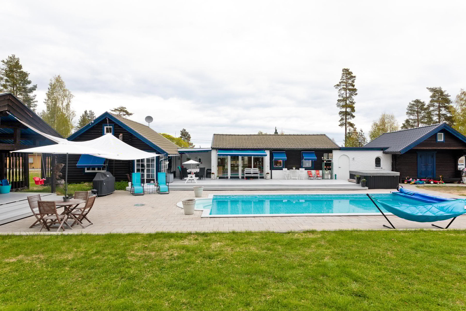 Runt poolen finns stora soldäck och uteplatser, perfekta för lata dagar i solen eller härliga grillkvällar med nära och kära. Gäststugan och den mindre jadestugan ger gott om plats för övernattande gäster och skapar en exklusiv känsla av en privat semesteranläggning.