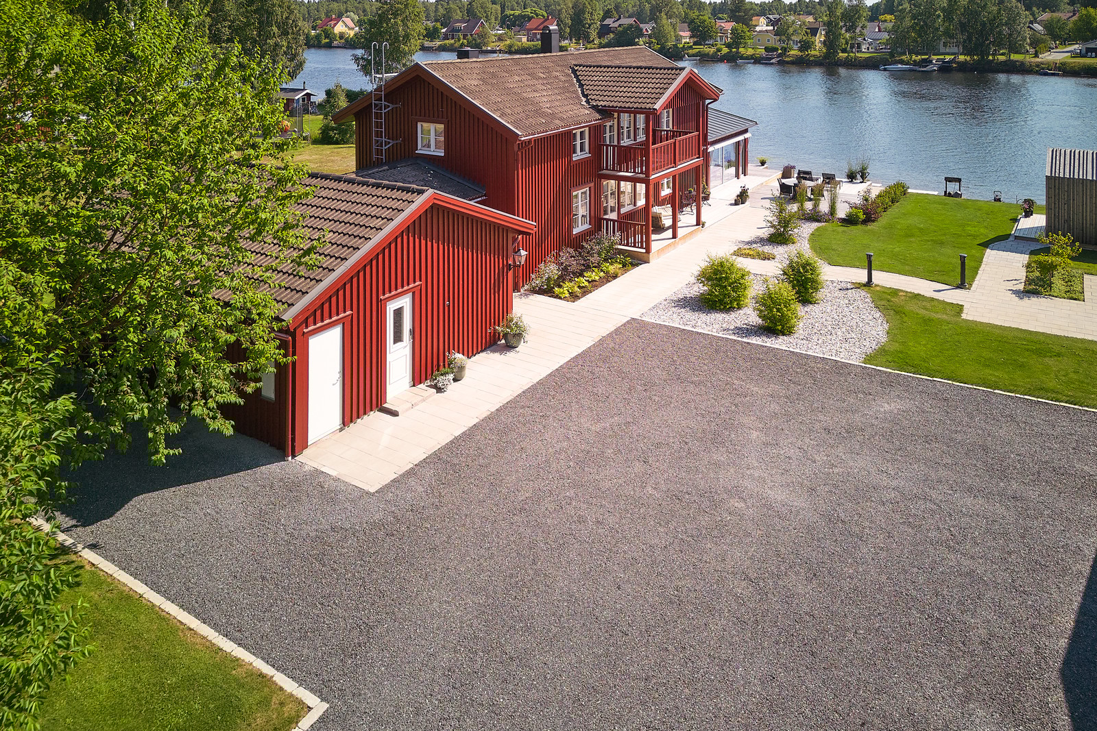 Rakt fram genom de skjutbara glaspartierna kommer du rätt ut på systemet av terrasser och bryggdäck. Det är i två etage med murpartier, blommande planteringar samt trappor i trä och granit. Det nedre etagets bryggdäck slutar precis över vattnet och när kvällssolen faller in över älven är atmosfären mycket speciell. Här har du koll på ungarnas lek på den egna sandstranden eller ute i älven. Kajaker, jollar och SUP:ar är bara att dra upp på stranden.