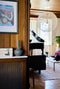 En blond trestavsparkett i ek tar över i en inre hall, den vita bröstpanelen med speglar följer med in. Här till vänster, bakom ett takhögt och skjutbart parti med svart industriglas, ligger ett ljust arbetsrum. Därinne kommer de spröjsade fönsterpartierna igen och rummet är det första av många exempel på bostadens formrena designlinje med spännande möten mellan dåtid och samtid. Rummets vackra ekparkett har en variant av holländsk läggning. Fönstren vetter mot uppfarten.