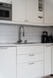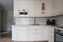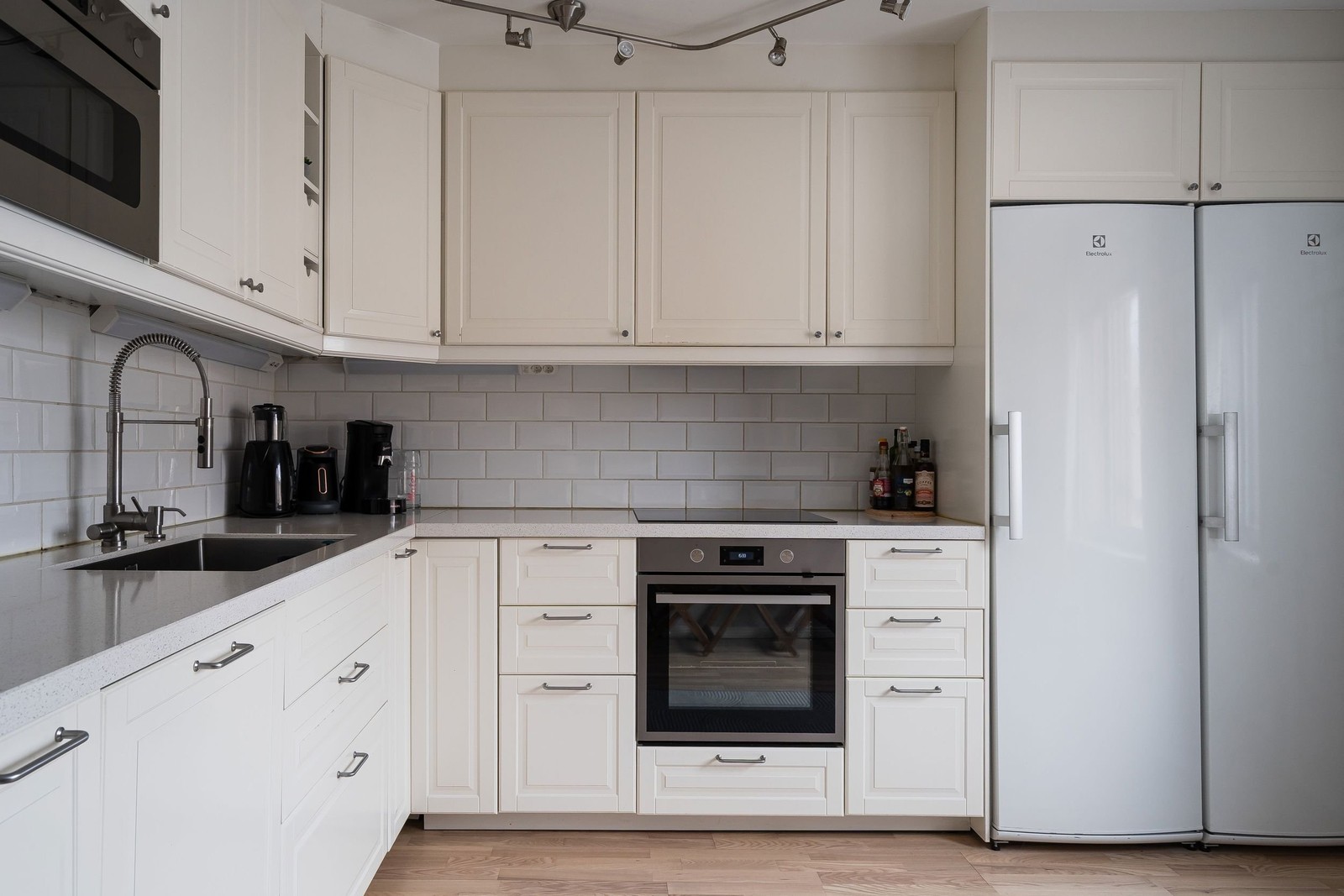 Köket är modernt och renoverades 2019. Köket har vita köksluckor, vitt kakel ovan arbetsbänk samt bänkskiva i sten. Den maskinella utrustningen som finns är fullstor kyl och frys, integrerad diskmaskin, induktionshäll samt inbyggd ugn och micro. Här får du plats med en matgrupp för ca 4-6 personer.