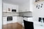 Här erbjuds en rum som både går att nyttja som sovrum och som matrum. Parkettgolv och ljusa väggar.