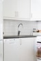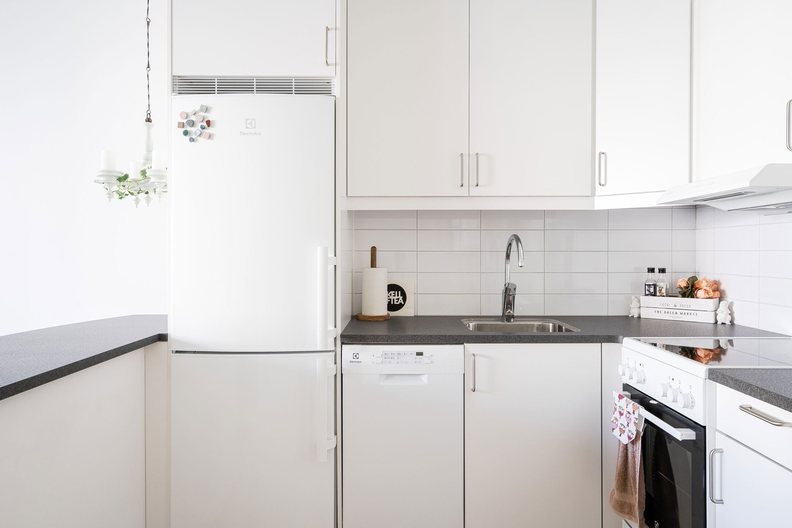 Kokvrån har vita köksluckor, vitt kakel ovan arbetsbänk samt bänkskiva i laminat. Den maskinella utrustningen som finns är spis, ugn, diskmaskin samt kombinerad kyl/frys. Köksö med plats för barstolar Badrum med kakel och klinker här finns dusch, wc och handfat. I rummet får du plats med säng och tillhörande möbler. Denna bostad stoltserar med en inglasad balkong.
