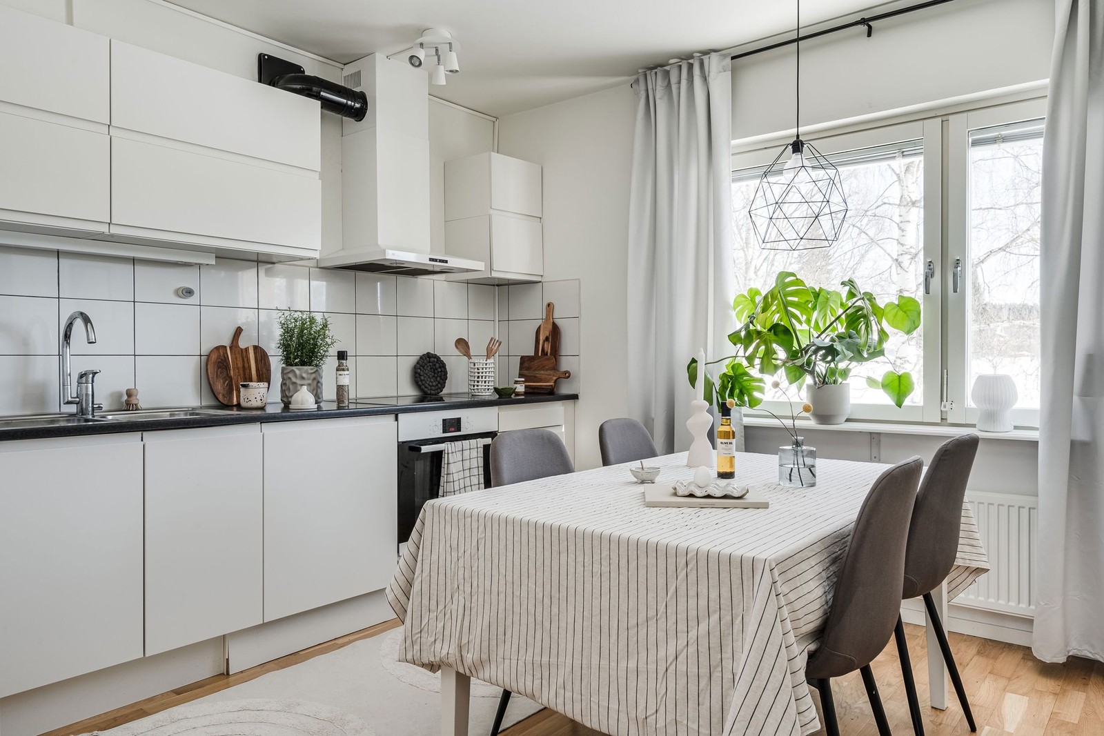 Modernt och stilrent renoverat kök (-21) med vita köksluckor, vitt kakel. bänkskiva i laminat, diskho samt blandare i rostfritt stål. Laminatgolv och ljusa väggar. Maskinparken består av en induktionshäll, varmluftsugn, köksfläkt, diskmaskin samt en kombinerad kyl och frys. Här får man plats med en matgrupp för ca fyra till sex personer.