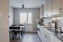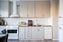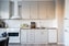 Modernt kök med gråa köksluckor och ljust kakel. Den maskinella utrusningen som finns är spishäll, ugn, diskmaskin kombinerad kyl/frys. Golvet består av ett klickgolv och väggarna är ljusa. I köket får du plats med en matgrupp för ca 4 personer.