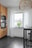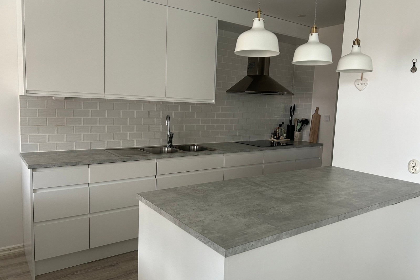 Köket är modernt och stilrent renoverat med vita köksluckor, grå laminatbänkskiva samt ljust kakel ovan arbetsytorna.