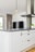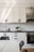 Köket är modernt och stilrent renoverat med vita köksluckor, grå laminatbänkskiva samt ljust kakel ovan arbetsytorna.