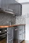 Bostaden erbjuder ett modernt och ljust kök som renoverades 2016 med gråa köksluckor, aluminium mosaik samt en tålig arbetsbänk i massiv ek. Den maskinella utrustningen består av en fullstor kyl och frys, spis, ugn och diskmaskin. Här ryms även en matplats för cirka 4–6 personer – perfekt för både vardagsmiddagar och helgens middagsbjudningar.
