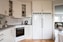 Vita köksluckor, vitt kakel, bänkskiva, diskho samt blandare i rostfritt stål. Parkettgolv och ljusa väggar. Maskinparken består av en spis, ugn, köksfläkt, diskmaskin samt en fullstor kyl och frys. Här får man plats med en matgrupp för ca 4 - 6 personer.