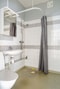 Badrummet är funktionellt och utrustat med dusch, WC och handfat. Plastmatta och halvkaklade väggar utgör en bra bas för att skapa ett modernt och fräscht badrum.