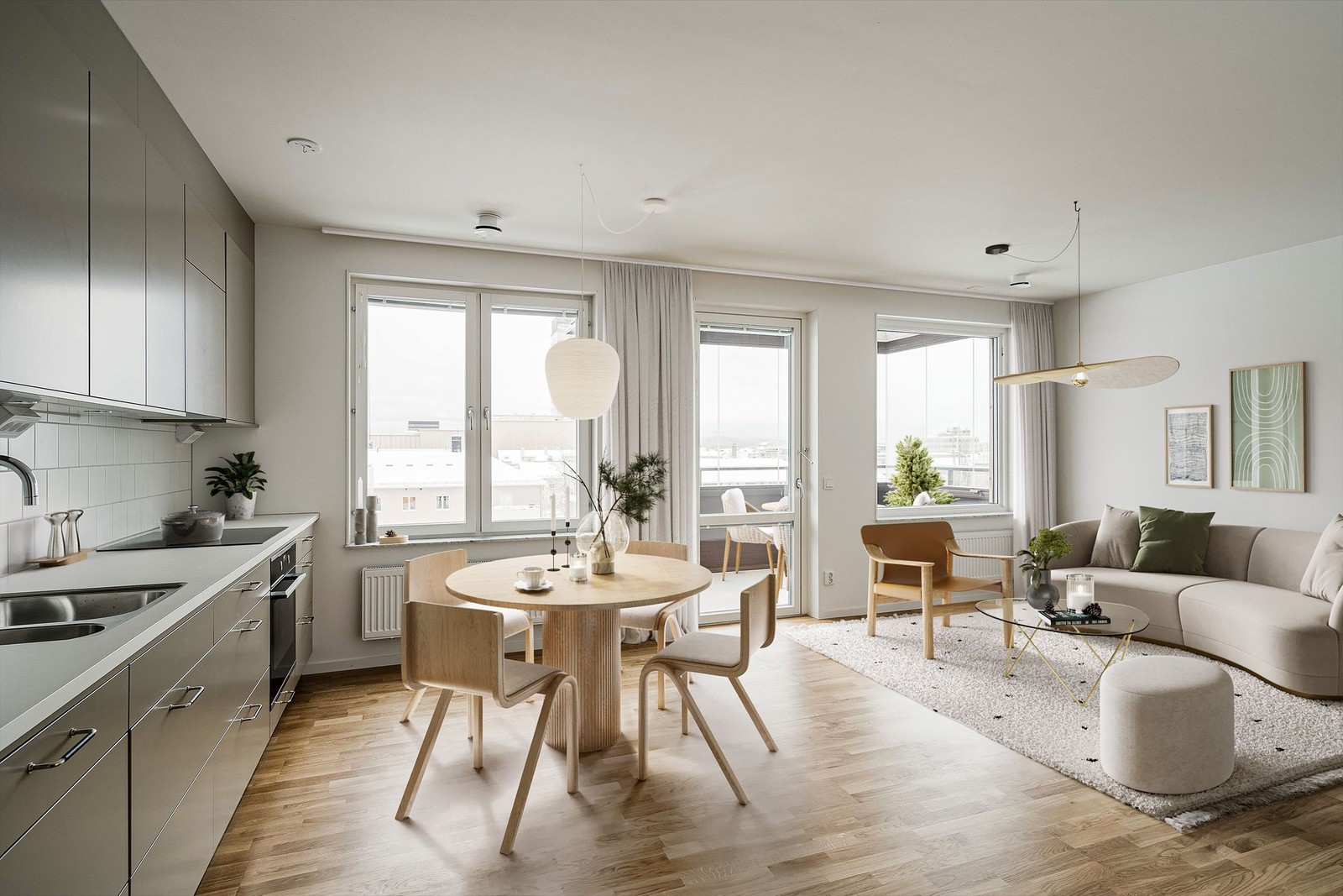 Bostaden erbjuder ett harmoniskt och stilrent intryck tack vare genomgående 3-stavs parkettgolv och ljusa ytskikt. Den öppna planlösningen mellan kök och vardagsrum skapar en social och rymlig känsla, perfekt för både vardagsliv och umgänge. Köket, i elegant beige ton med vitt kakel som stänkskydd, är utrustat med en vit bänkskiva som kombinerar design och funktion. Här finns moderna vitvaror såsom en induktionshäll, inbyggd ugn och mikrovågsugn samt kombinerad kyl och frys. Dessutom har bostaden en rymlig inglasad balkong som förlänger både boendeytan och möjligheterna att njuta av hemmet året runt.