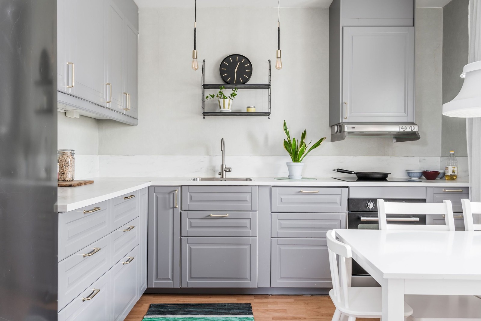 Köket renoverades ca 2018. Köksluckorna är gråa, vitt melerad stänkskiva i laminat ovan bänkskiva samt bänkskiva i laminat. Den maskinella utrustningen som finns är induktionshäll, ugn, integrerad diskmaskin samt fullstor kyl och frys. I köket får du plats med en matgrupp för ca 4 personer. Golvet består av ett laminatgolv och väggarna är ljusgröna.