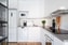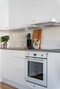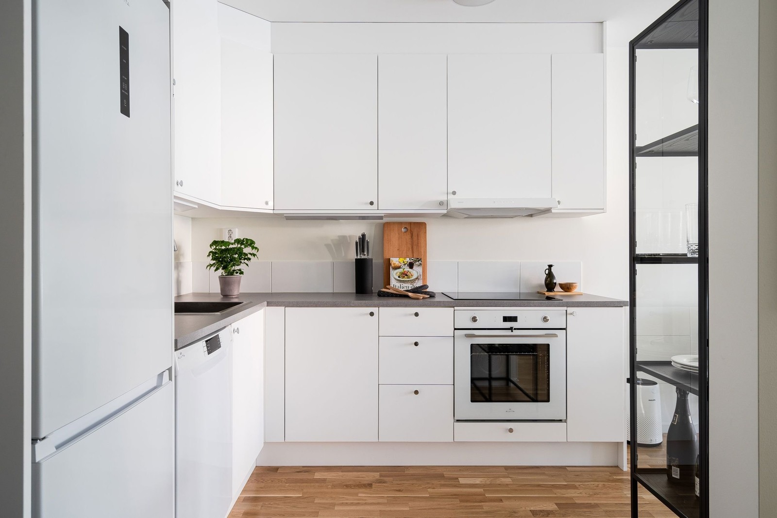 Köket har vita köksluckor, vitt kakel ovan arbetsbänk samt bänkskiva i laminat. Den maskinella utrustningen som finns är ugn, inbyggd micro, induktionshäll, diskmaskin samt en kombinerad kyl och frys.