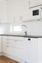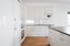 Vita köksluckor, vitt kakel, bänkskiva i laminat, praktisk köksö, diskho och blandare i rostfritt stål. Ekparkettgolv och ljusa väggar. Maskinparken består av en induktionshäll, ugn, köksfläkt, diskmaskin, mikro samt en kombinerad kyl och frys. Här får man plats med en matgrupp för ca 4 - 6 personer.