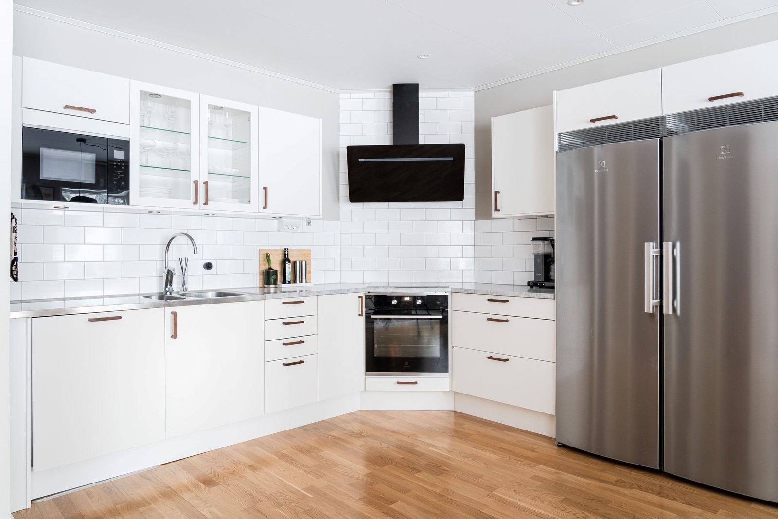 Köket har vita köksluckor, vitt kakel ovan arbetsbänk samt arbetsbänk i laminat. Den maskinella utrustningen som finns är induktionshäll, inbyggd ugn och micro, integrerad diskmaskin samt full stor kyl och frys.